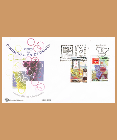 Aparecen dos nuevos sellos pertenecientes a la serie Vinos con Denominación de Origen, uno dedicado a Rioja y el otro a Manzanilla-Sanlúcar de Barrameda. La Denominación de Origen Rioja extiende su territorio en zonas de las comunidades autónomas de La Rioja (un 80%), del País Vasco (un 15% de la provincia de Álava) y de Navarra (un 5%). Son tierras, en su mayoría, próximas a los ríos Ebro, Najerilla, Leza, Cidacos, Iregua, Tirón y Oja. Comprende el territorio unas 50.000 hectáreas cultivadas que producen de media anual en torno a 200 millones de litros de los que La Rioja Alavesa y la zona de Sonsierra aportan un 25%, La Rioja Alta un 43% y La Rioja Baja un 32%. Los vinos de Rioja se caracterizan por sus aptitudes y singular proceso de crianza y envejecimiento. El vino, en su mayoría, se cría en barricas de roble de 225 litros. La madera le aporta un aroma peculiar que conservará tras completar su crianza en botellas de vidrio. De las variedades de uva: tempranillo, garnacha, graciano y mazuelo, surgen los tintos y rosados. Mientras que de la malvasía, viura y garnacha blanca resultan los blancos. Atendiendo a los niveles de crianza establecidos por el Consejo Regulador de la Denominación de Origen Rioja hallamos las categorías siguientes: Joven (vino sin crianza), De crianza (dos años en bodega), Reserva (tres años) y Gran Reserva (cinco años). La Denominación de Origen Manzanilla-Sanlúcar de Barrameda, aunque pertenece al mismo